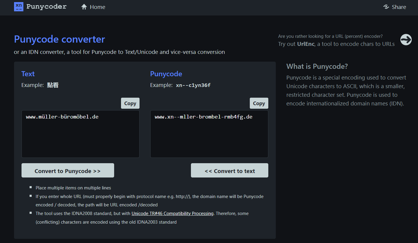 Dažādās tīmekļa vietnēs ir pieejami bezmaksas Punycode ģeneratori, kas pārvērš IDN adreses ASCII formātā. Viens no piemēriem ir Punycoder.