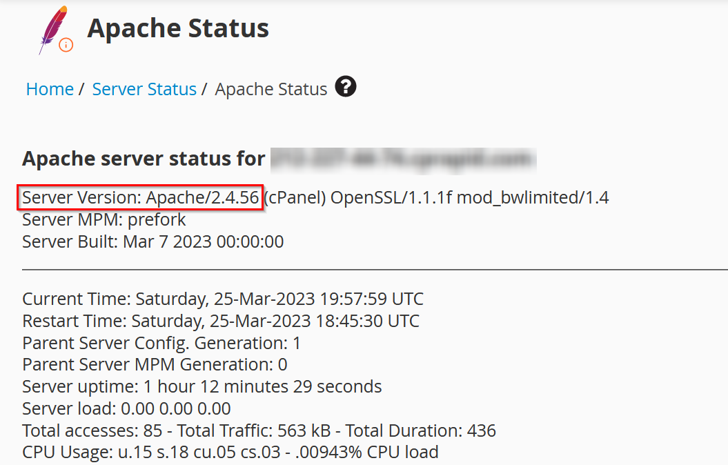 cPanel jūs varat apskatīt savu Apache versiju sadaļā**„Servera informācija**”.