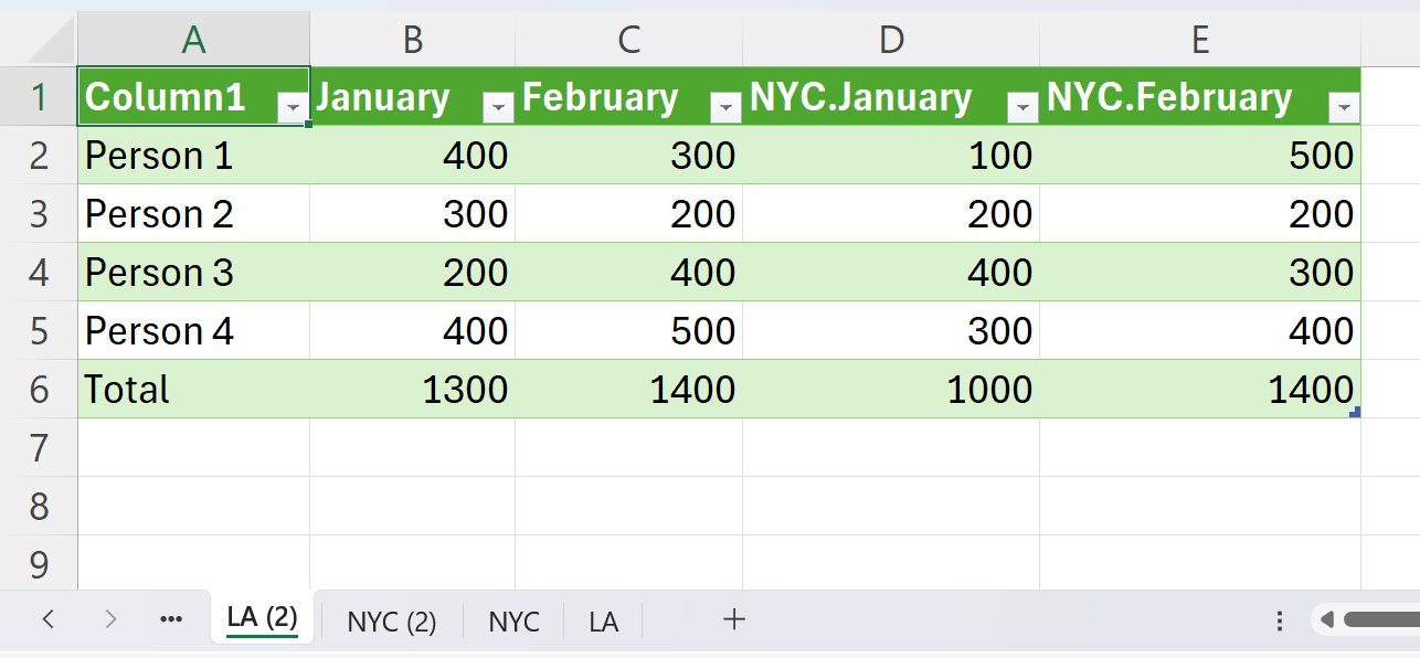 Ja vēlaties apvienot atsevišķas Excel darblapas, izmantojiet funkciju „Apvienot”. Lai izmantotu šo funkciju, jūsu Excel failā jābūt vismaz divām cilnēm. Turpmākajā piemērā mēs apvienosim klientu datus no Ņujorkas un Losandželosas.