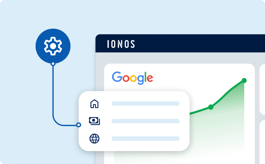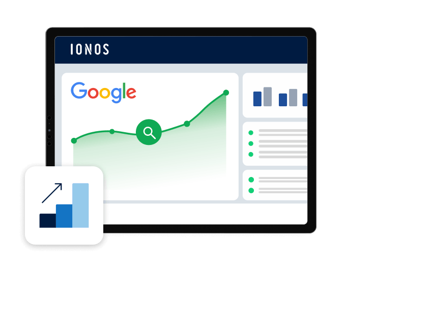 For your company website to rank higher among the organic (non-sponsored) search results, your content must be optimized. This is done through so-called search engine optimization (SEO). In addition to IONOS Search Engine Marketing, we offer IONOS rankingCoach as a further efficient online marketing method as an add-on to your hosting package. The technical and textual elements of your website are optimized in a way that leads Google to view it as more relevant with regard to your keywords and consequently rank it higher. Ultimately, your optimized site is rewarded with higher visibility among the search results.