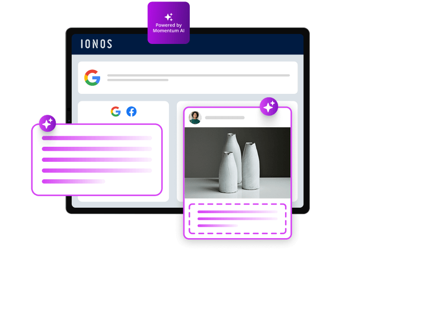 Google always strives to give users the best possible search results. The company works diligently to distinguish high-quality websites from those which are untrustworthy or not as rich in content. With IONOS hosting and the associated website and shop solutions, you are on the safe side from the very beginning. Websites hosted with us have the best possible load time, and the page layout makes it easy to optimize for Google. We cannot create the texts for your products and services, however, we want to support you in writing text that will help to improve search engine rankings.