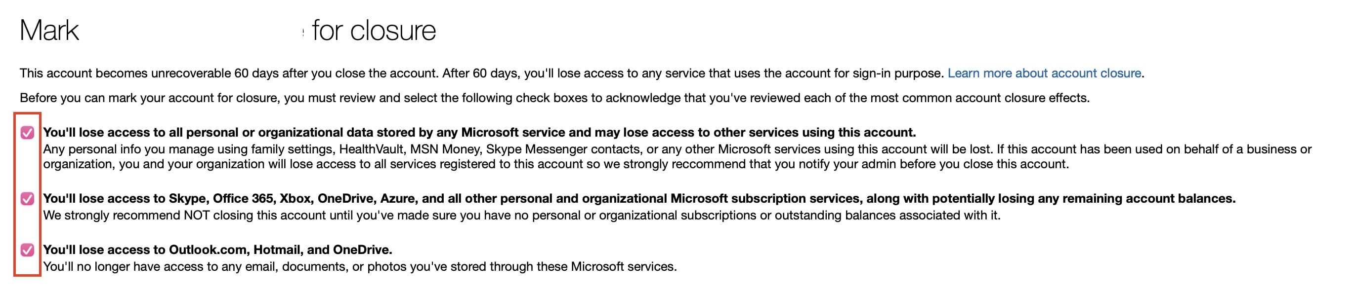 Trinn 4: Gjennomgå tilleggsinformasjonen og kryss av i de aktuelle boksene for å bekrefte at du forstår hva som vil skje når kontoen din blir stengt.