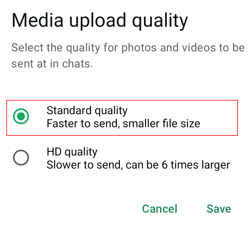 Siden dataforbruket er høyest når du sender og mottar medier som bilder, anbefales følgende tiltak: Under «Lagring og data» kan du angi at automatiske nedlastinger kun skal skje via Wi-Fi, enten for alle medier eller for utvalgte medier. Du vil fortsatt kunne laste ned medier i chatten manuelt ved å trykke på dem når du bruker mobilen. Andre måter å spare data på er å aktivere lavere dataforbruk for WhatsApp-samtaler og redusere kvaliteten på medieopplastinger.