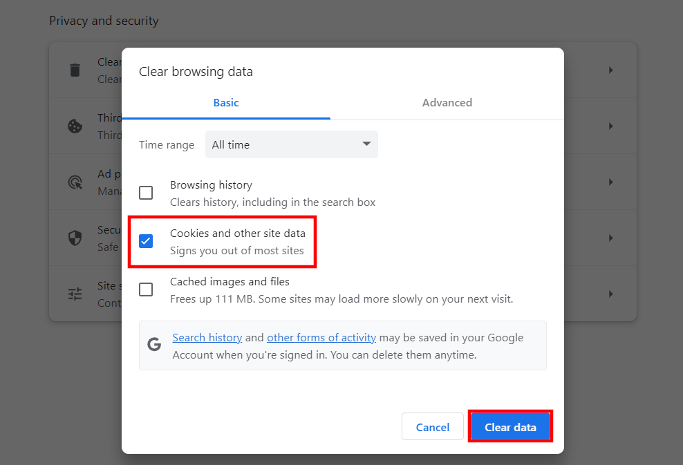 - Bla til «Cookies og nettstedsdata» og klikk på «Slett data»-knappen.