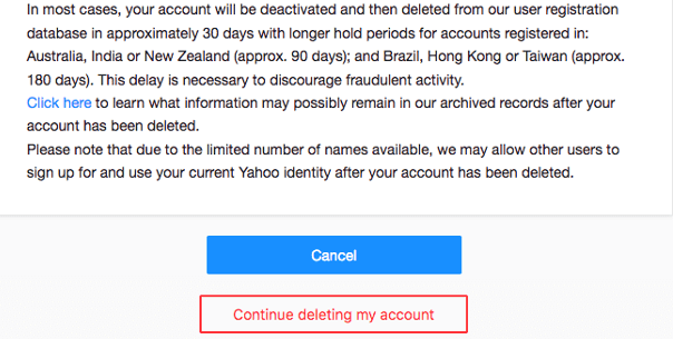 Het duurt even voordat uw Yahoo-account volledig is verwijderd. Yahoo schort uw account in eerste instantie 30 dagen op. Afhankelijk van het land waar uw account is geregistreerd, kan het proces langer duren: tot 90 dagen (Australië, Nieuw-Zeeland) of zelfs 180 dagen (Brazilië, Taiwan, Hongkong, India). Als u tijdens deze periode niet inlogt op uw account, wordt deze na de deadline automatisch verwijderd.