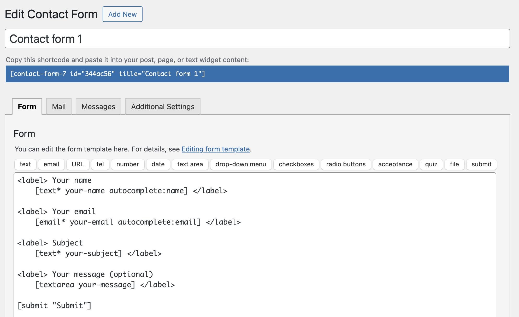 A interface do Contact Form 7 é simples, mas contém importantes recursos.