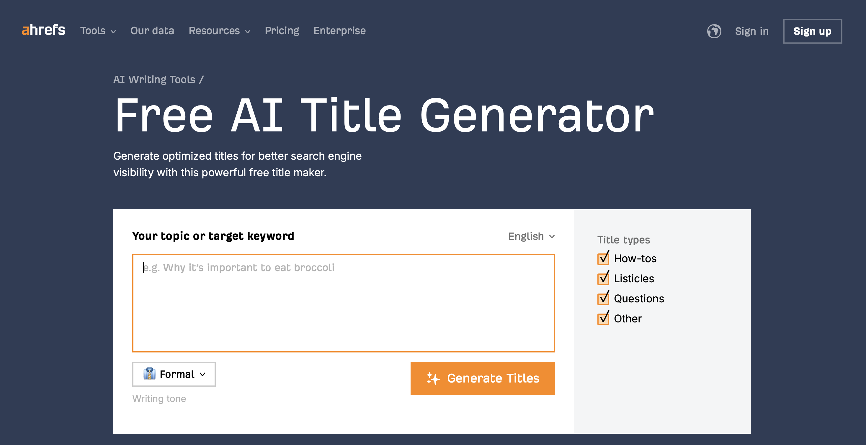 A empresa de tecnologia Ahrefs , com sede em Singapura, lançou uma série completa de ferramentas IA para SEO. Com as ferramentas de otimização inteligentes e gratuitas Free AI Writing Tools, você consegue gerar conteúdo em texto, como parágrafos e resumos. Mas não é somente isso que essa AI SEO consegue fazer: ferramentas de criação de metainformações e transcrição são ainda mais interessantes.