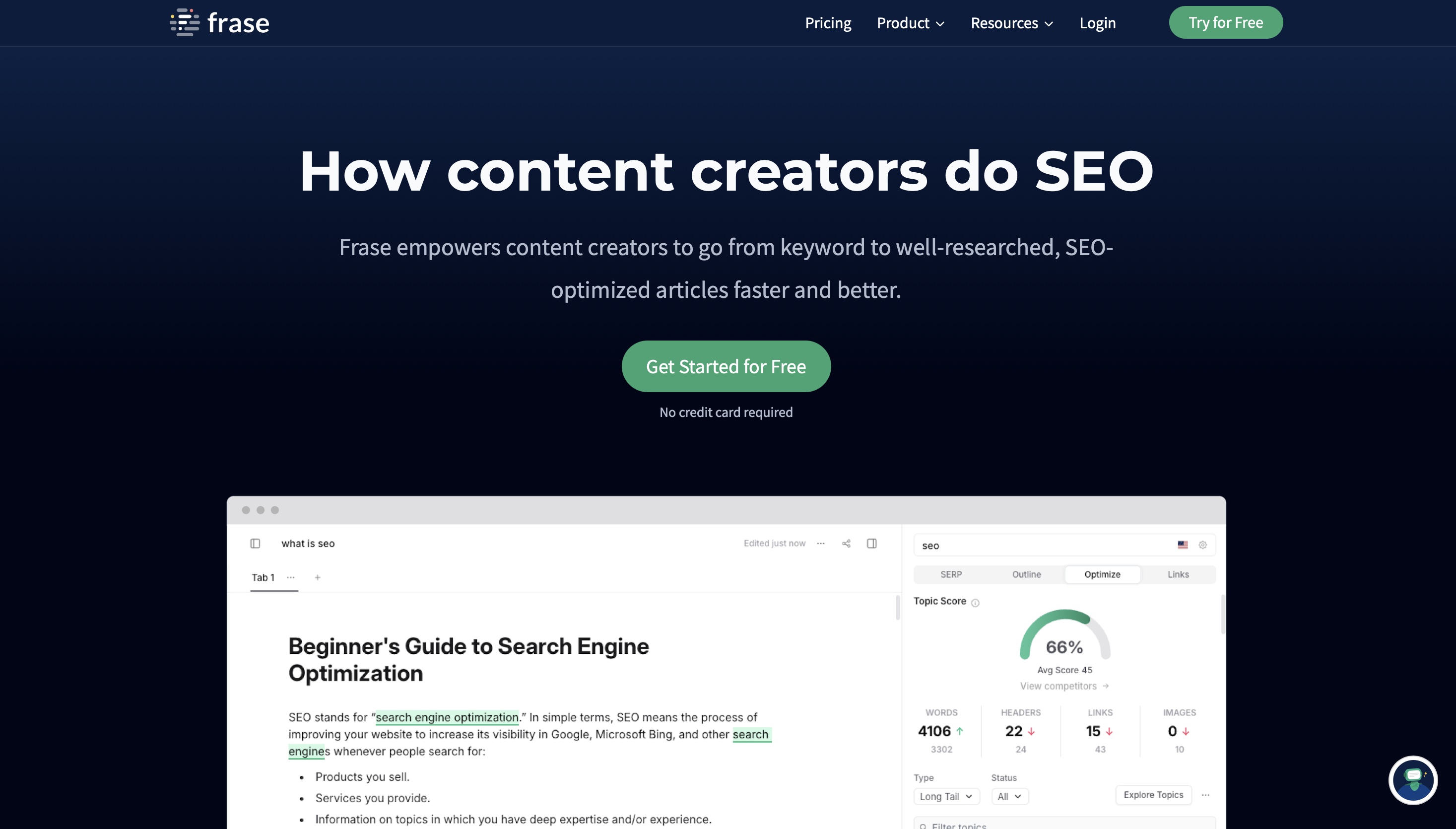Frase é uma ferramenta poderosa de pesquisa por palavras-chave e de otimização de textos. Faça uso dela para obter ideias sobre novos conteúdos. Com ela, você tem acesso aos principais resultados de buscas e cria briefings completos a partir dos achados. Ainda, essa IA SEO analisa os textos do seu site e retorna sugestões de aprimoramento e de inclusão de palavras-chave não exploradas.