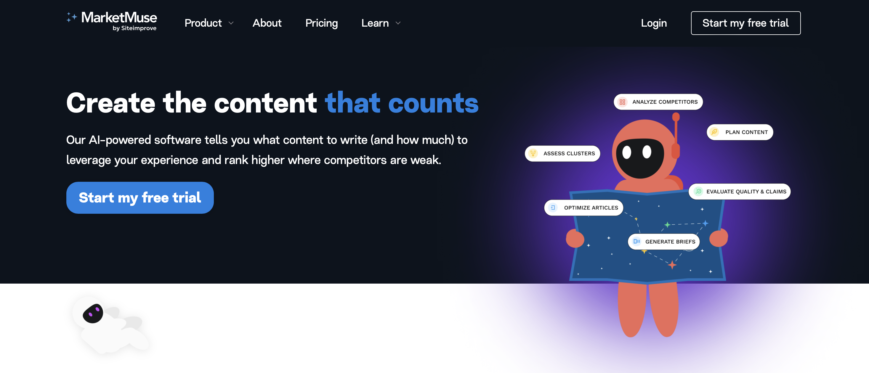 MarketMuse é uma IA SEO que tem foco no planejamento e na otimização de conteúdo. Para tanto, esta inteligência artificial analisa o seu site, detecta os temas mais importantes e elabora um plano de conteúdo completo, que abrange até análises de mercado. Assim, você descobre, em tempo recorde, o que falta no seu site e o que deve ser priorizado.