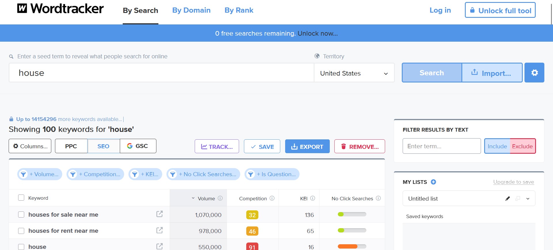 Desde os tempos em que o Google ainda estava em fase beta, a empresa Wordtracker se dedicava ao desenvolvimento de técnicas para capturar e avaliar a frequência de termos nos motores de busca. Com o tempo, a empresa sediada em Euston desenvolveu diversos conceitos para esse fim, como o Keyword Efficiency Index (KEI), que reflete a eficiência das palavras-chave em números. A ferramenta de pesquisa de palavras-chave própria da Wordtracker, Wordtracker.com, é, sem dúvida, uma das melhores alternativas pagas ao Keyword Planner. Existe uma versão gratuita fortemente limitada, que permite uma pesquisa por dia.