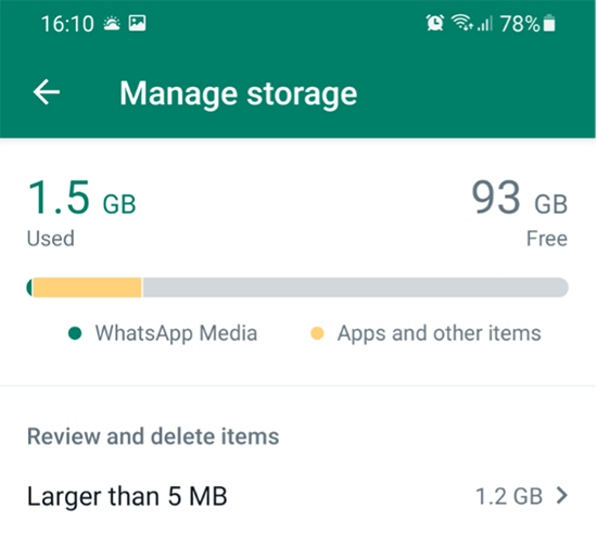 - Agora, o aplicativo mostrará no topo quanto espaço de armazenamento está ocupado e quanto espaço ainda está disponível para o WhatsApp. Assim, você terá uma visão geral.