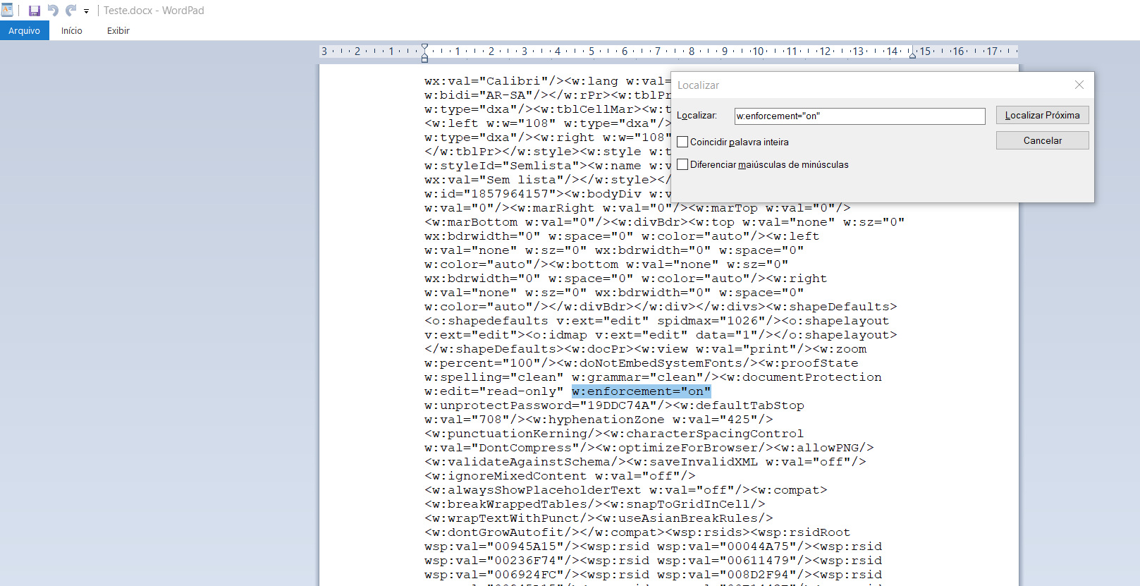 Passo 1: Com o documento bloqueado aberto, clique na aba “Arquivo”, no canto superior esquerdo e, em seguida, em “Salvar como”. Passo 2: Navegue até a pasta onde você deseja salvá-lo e selecione o tipo de arquivo “Documento XML do Word (.xml)”, na caixa “Tipo”. Salve o documento neste formato. Passo 3: Abra o documento XML recém-criado com o editor do Windows WordPad. Faça isso clicando no arquivo com o botão direito e selecionando “Abrir com”. Passo 4: No documento, busque pela cadeia de caracteres “w:enforcement” usando a combinação de teclas [Ctrl] + [F]. Ela será exibida comow:enforcement=“1”ouw:enforcement=“on”.