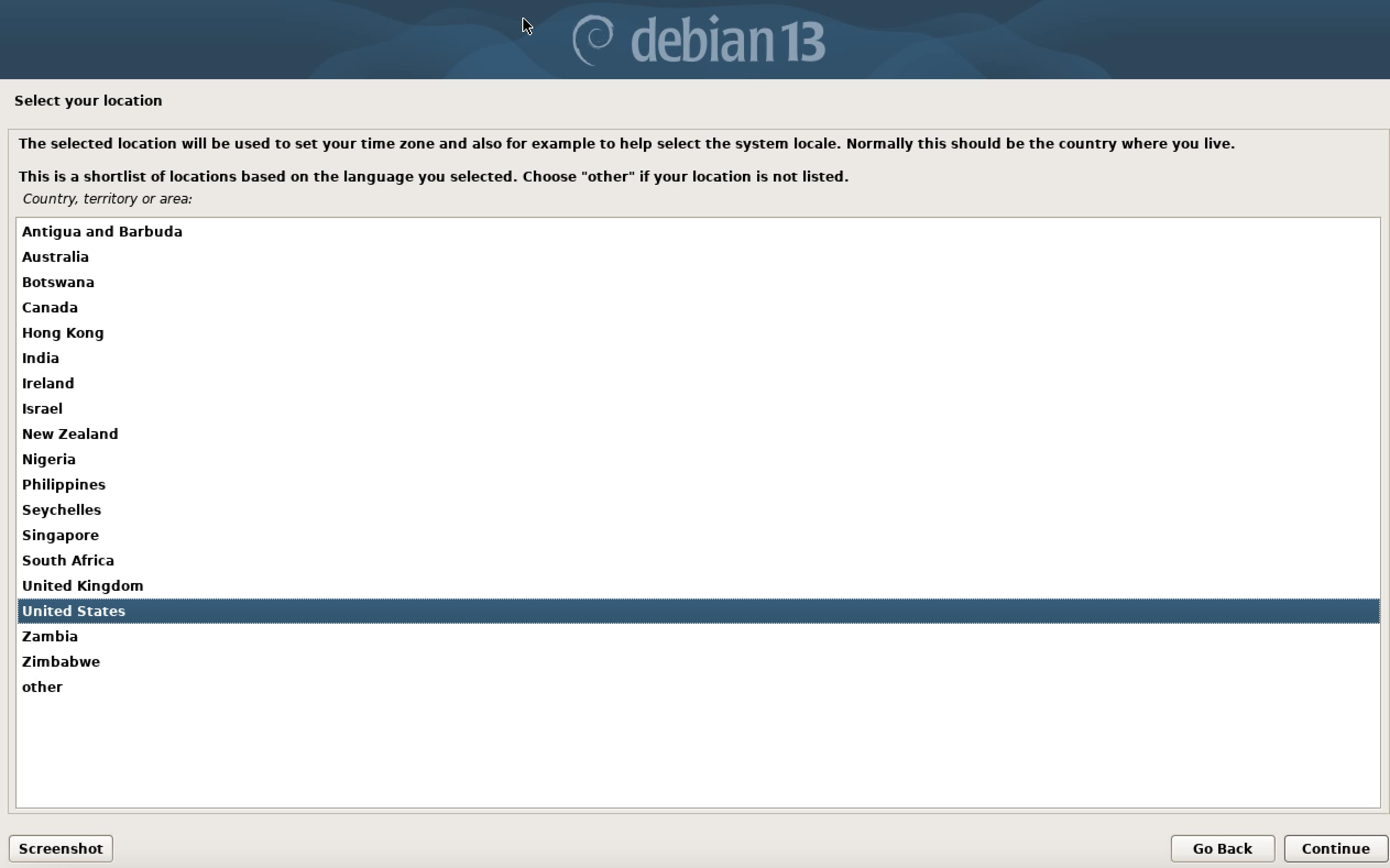 Depois, selecione seu país e região. O Debian usa essa informação para definir o fuso horário e sugerir configurações padrão adequadas.