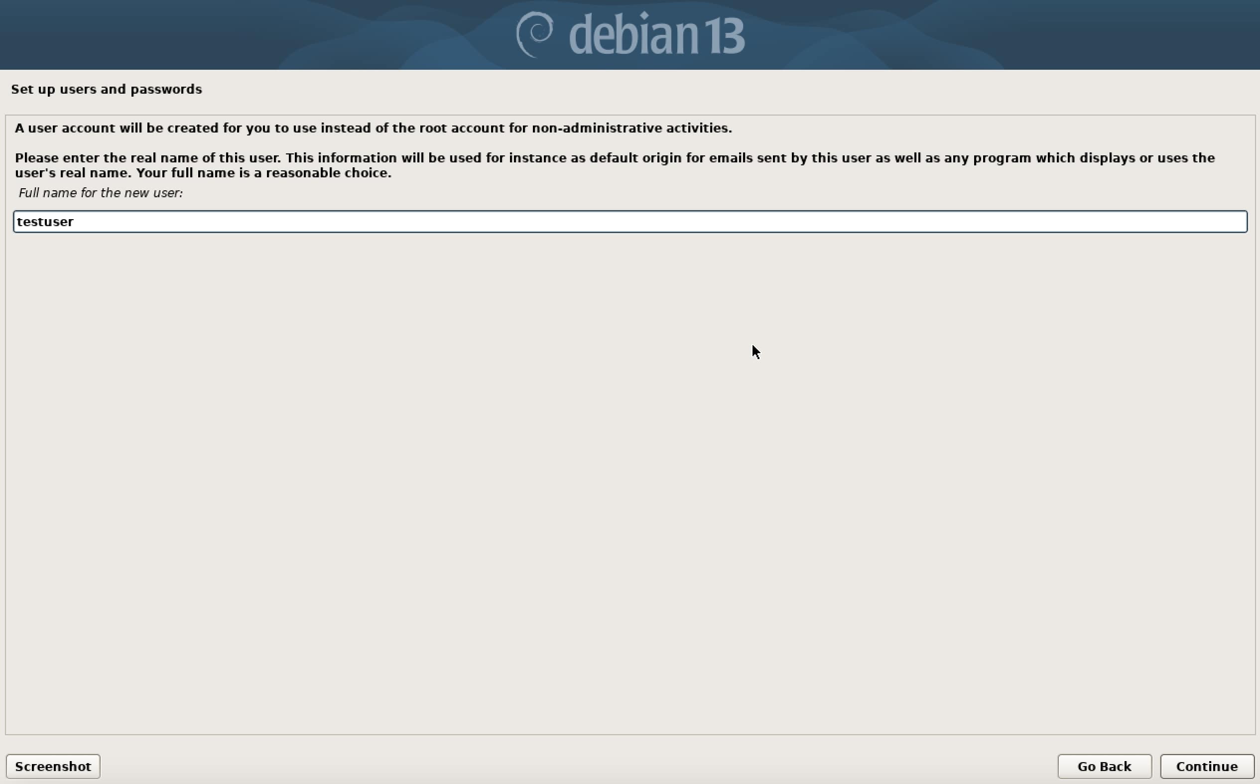 Depois, o Debian criará um usuário padrão para uso diário. Insira o nome da pessoa que usará o computador e escolha o nome de usuário (login).