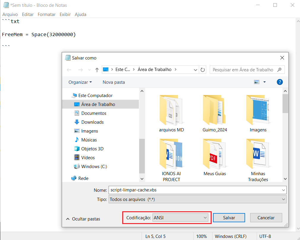 FreeMem = Space(32000000)txtSalve o arquivo com o nome desejado. Certifique-se de que a codificação esteja definida como ANSI, caso o editor ofereça essa opção. Por fim, substitua a extensão padrão .txt por .vbs. Só assim o Windows reconhecerá o arquivo como um script.