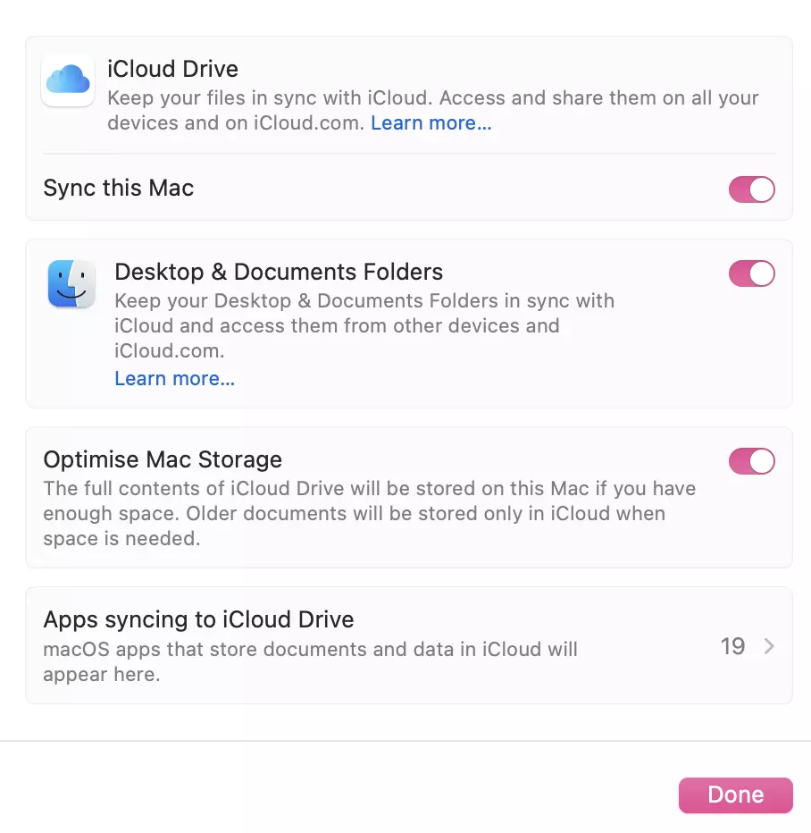 Desde 2011, a Apple oferece o iCloud como uma solução de armazenamento em nuvem para fotos, vídeos e outros arquivos. O iCloud Drive foi lançado ao mesmo tempo e tem sido aprimorado continuamente desde então. Enquanto o iCloud representa o armazenamento on-line propriamente, o iCloud Drive é a aplicação que facilita a realização automática de backups no Mac e em outros dispositivos Apple e Windows, além de permitir salvar, editar e compartilhar arquivos com facilidade. O espaço de armazenamento disponível depende do plano escolhido, sendo que 5 GB são gratuitos.