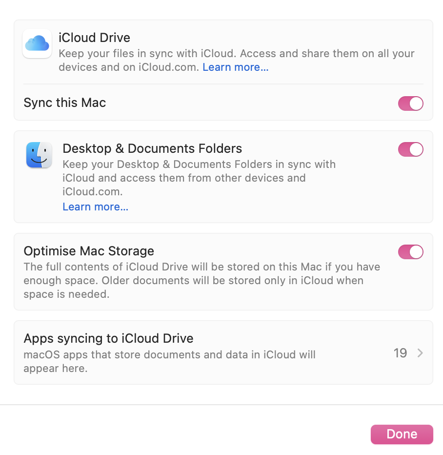 Desde 2011, a Apple oferece o iCloud como uma solução de armazenamento em nuvem para fotos, vídeos e outros arquivos. O iCloud Drive foi lançado ao mesmo tempo e tem sido aprimorado continuamente desde então. Enquanto o iCloud representa o armazenamento on-line propriamente, o iCloud Drive é a aplicação que facilita a realização automática de backups no Mac e em outros dispositivos Apple e Windows, além de permitir salvar, editar e compartilhar arquivos com facilidade. O espaço de armazenamento disponível depende do plano escolhido, sendo que 5 GB são gratuitos.