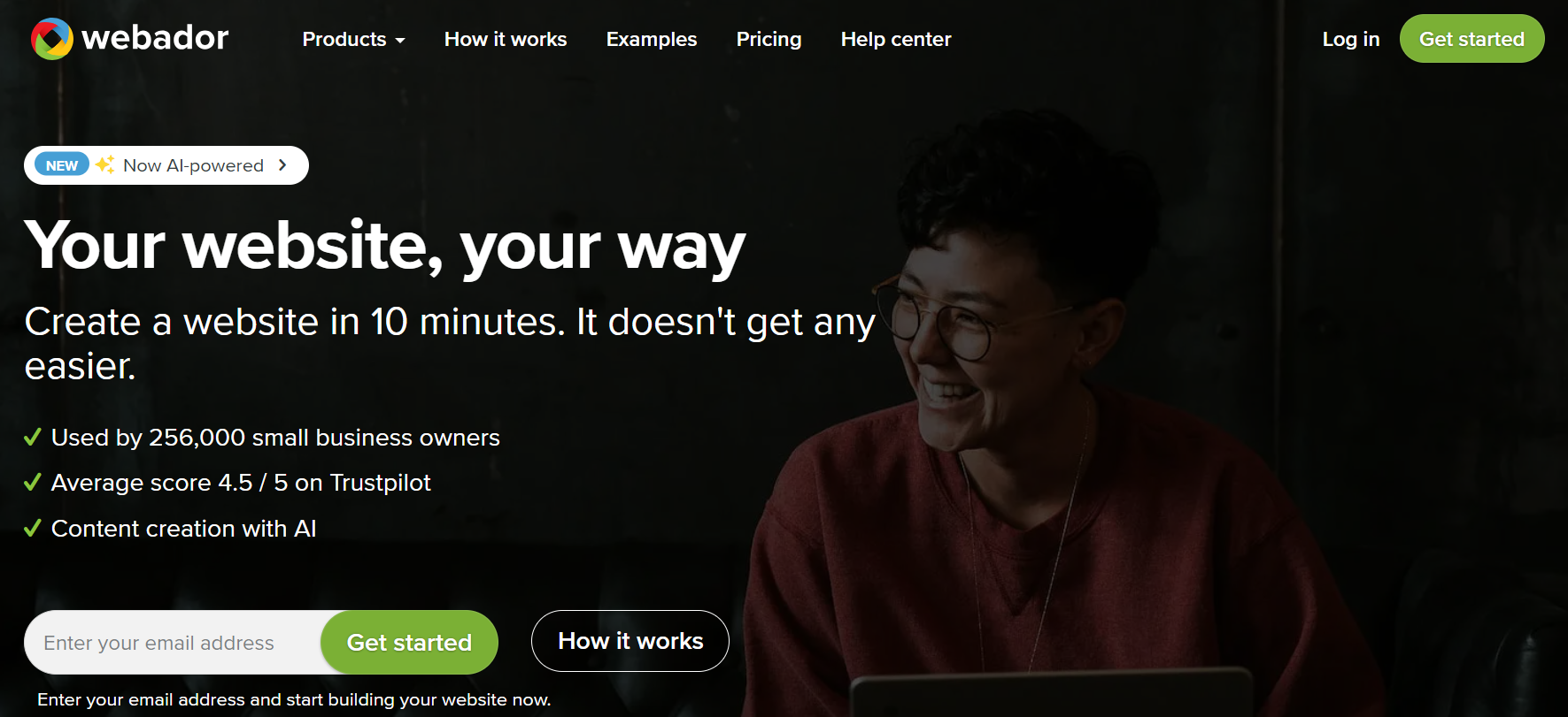 Webador é uma opção amigável e de baixo custo para pequenas empresas que desejam criar um site profissional. A plataforma oferece otimização de SEO e criação de conteúdo apoiada por IA, permitindo que você simplesmente indique que tipo de site precisa, enquanto a IA cuida do restante. Um sistema intuitivo de arrastar e soltar permite a rápida personalização do conteúdo e design do site, e mais de 100.000 fotos de estoque gratuitas estão disponíveis para o design visual.