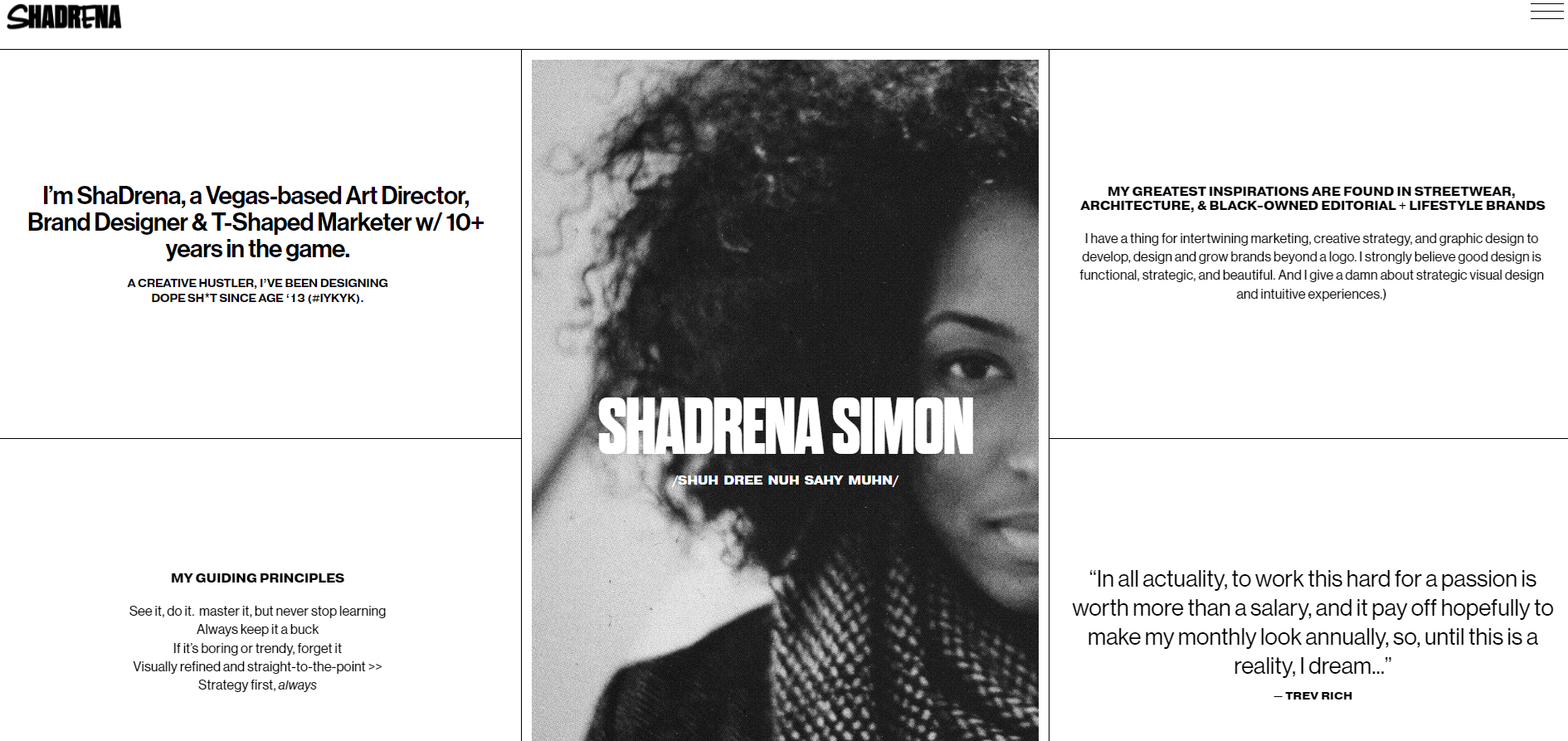 A página “Sobre mim” da designer ShaDrena Simon descreve quem ela é e o que ela faz, mas também menciona suas inspirações e os princípios que guiam seus projetos. Tudo isso em poucas palavras. Uma citação no canto inferior direito dá um toque pessoal e criativo.