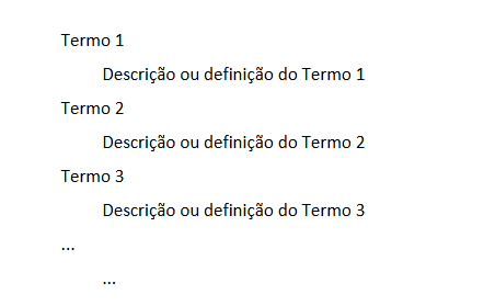 <dl>…</dl>: Indica o início e o término da lista de definição.<dt>…</dt>: Indica o termo que será descrito.<dd>…</dd>: Indica a definição ou descrição do termo escrito entre as tags<dt>. É inserida após as tags<dt>.