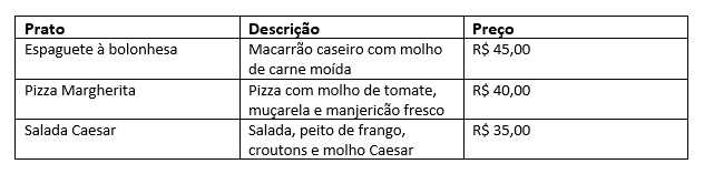 Para ilustrar como as tags funcionam, vamos apresentar um exemplo simples de tabela HTML. Neste caso, descrições e preços de três pratos. Na linha de cabeçalho, definimos os títulos das três colunas: “Prato”, “Descrição” e “Preço”. Em seguida, há mais três linhas com informações. A tabela HTML terá, portanto, quatro linhas e três colunas: