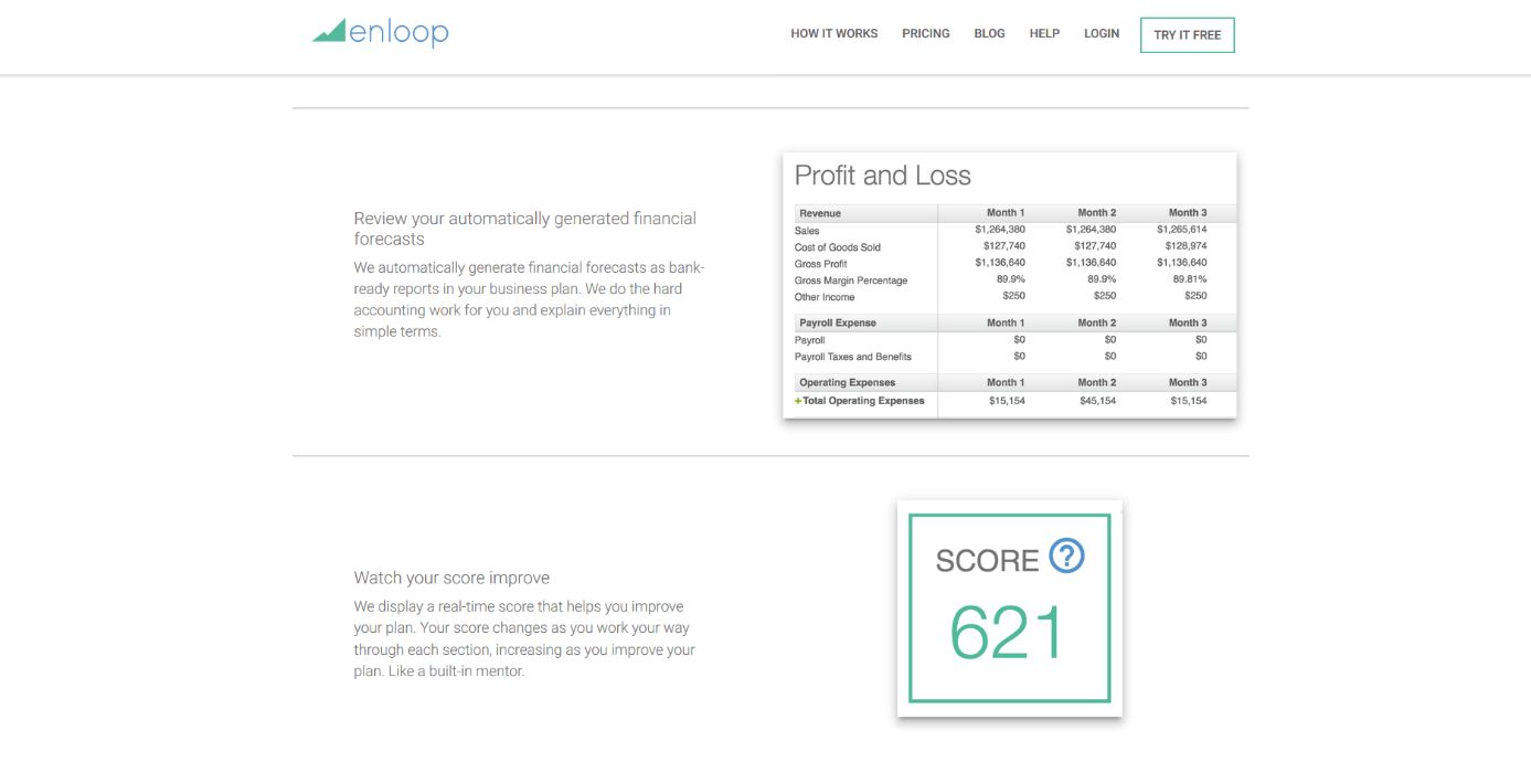 Semelhante ao StratPad, o Enloop oferece assinaturas pagas e gratuitas. Ele está disponível como um aplicativo que permite que você crie um plano de negócios em etapas simples. O aplicativo também pode ajudar você ao longo do ano, mantendo um registro do plano e compartilhar a sua pontuação com investidores e banqueiros. O básico, como planejar um esboço passo a passo do que você deseja fazer, está naturalmente incluído no software Enloop, assim como recursos de visualização do fluxo de caixa e de previsão financeira.