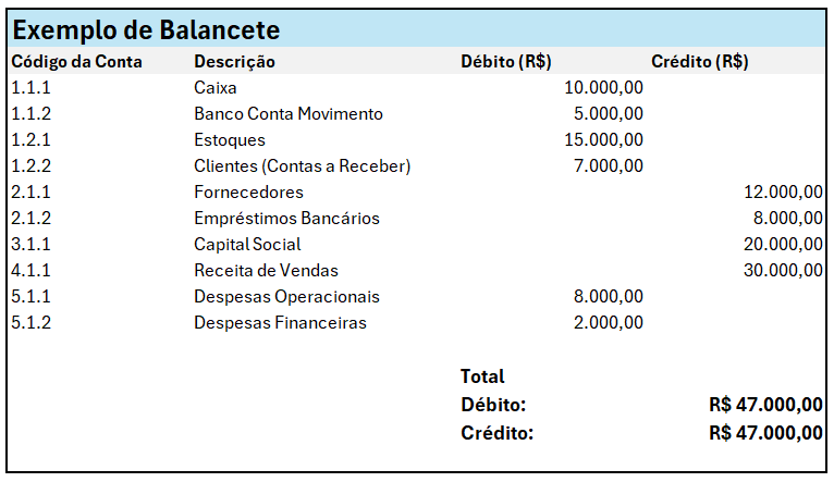 Para entender melhor o conceito, apresentamos agora um exemplo de balancete, para ajudar você a estruturar o seu. Claro, cada balancete deve ser adaptado às condições da empresa correspondente.