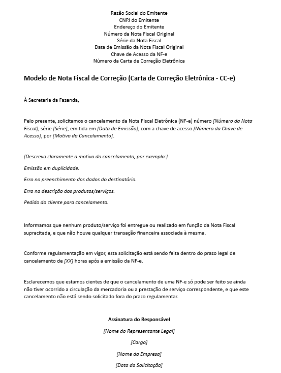 Modelo: Nota fiscal de correção e nota fiscal de cancelamento