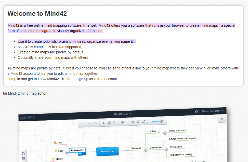 O Mind42 é totalmente gratuito e financiado por anúncios (sem afetar a experiência do usuário). Sua interface simples permite colaboração em tempo real por convites por e-mail e links diretos. Além disso, essa ferramenta de mind map possibilita exportação do arquivo gerado em RTF, PDF, JPEG, PNG e outros formatos. Sua limitação é que o histórico de alterações só pode ser visualizado pelo criador do mapa, e não pelos demais membros da equipe.
