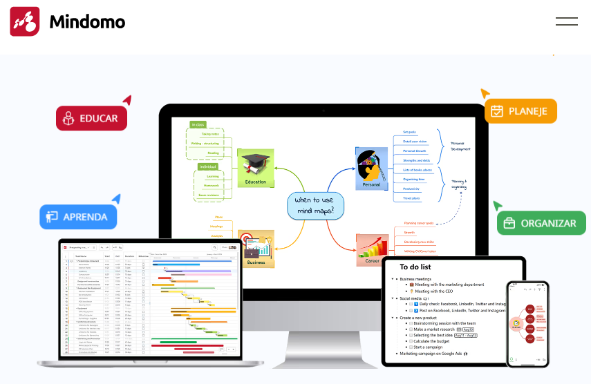 | Mindomo | Integração multiplataforma | PDF, TRF, TXT, MPX, HTML, PNG | Aplicação para macOS, Windows, Linux, iPad e Android | E-mail, Google, Facebook, Yahoo!, Microsoft 365, Windows Live, Clever, MC Online, Yilan | Grátis; Pago a partir de ⬠5,50/mês |