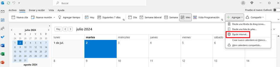 - Altere a visualização do Outlook para a vista de calendário e clique em «Início», depois em**«Adicionar calendário»e«Da Internet**».