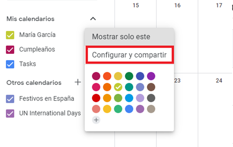 - Na secção à esquerda, abra o menu de configurações do calendário que pretende subscrever clicando nos três pontos que se encontram ao lado do calendário em questão. Selecione**«Configurar e partilhar**».