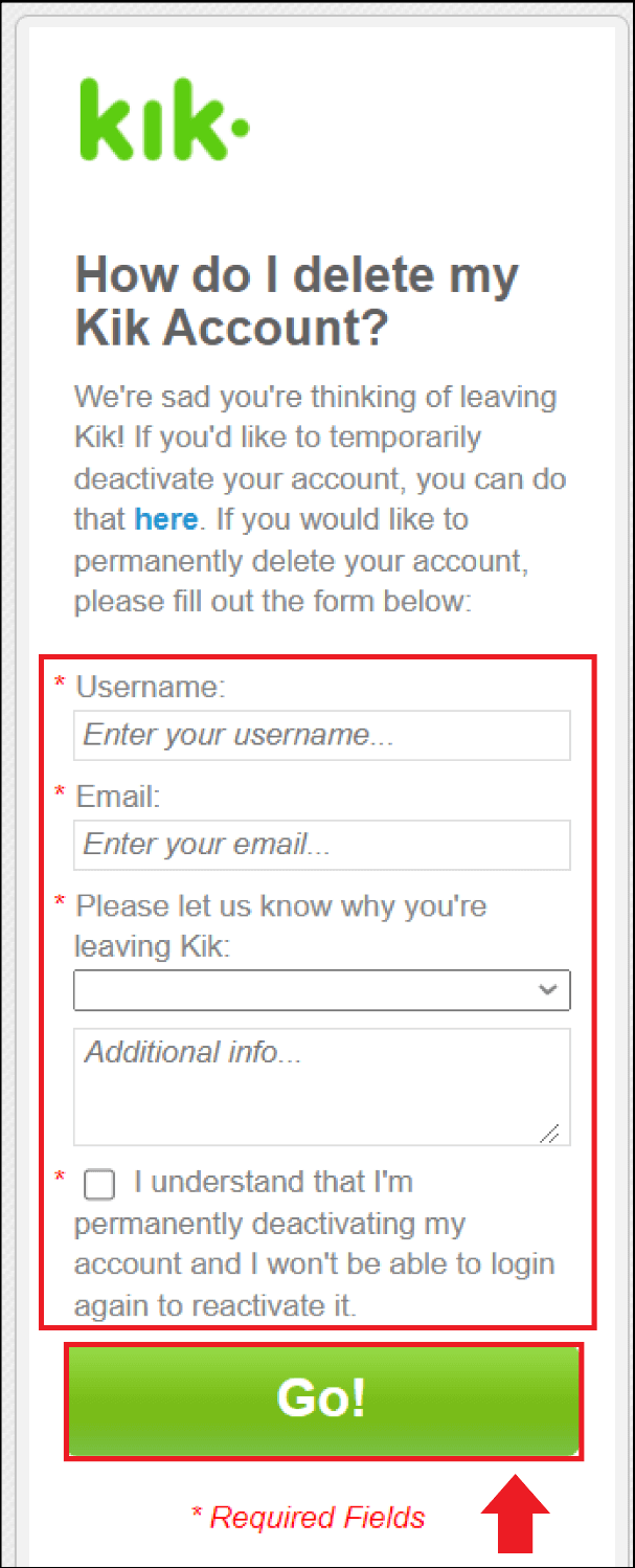 Passo 3. Clique no botão «Go!» para eliminar a conta do Kik.