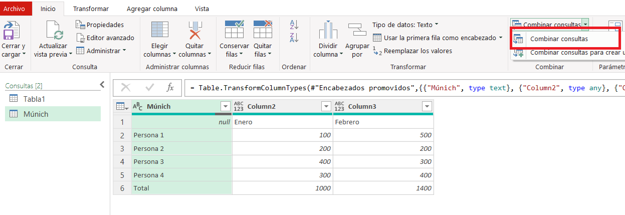 Passo 4. Agora, seleciona a função «Combinar» e clica em «Combinar consultas».