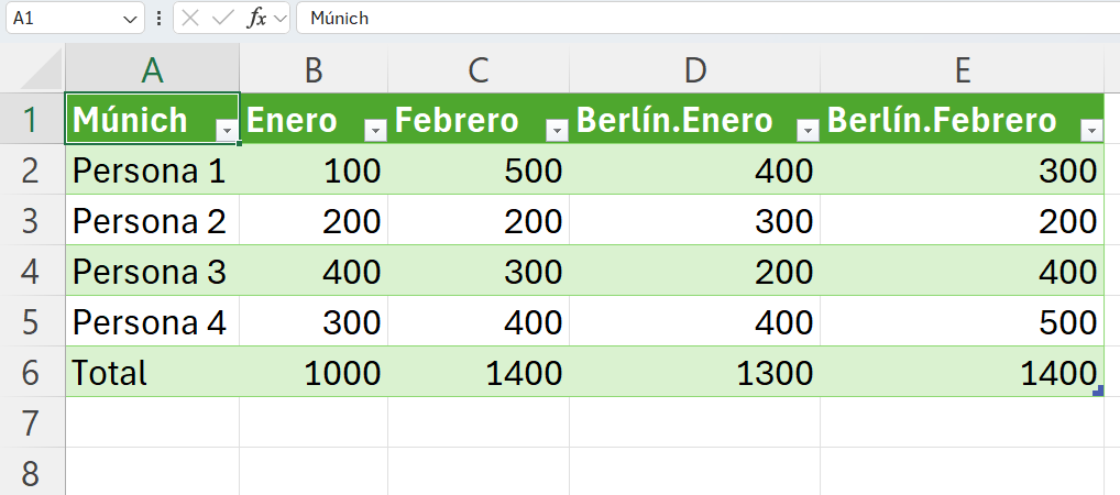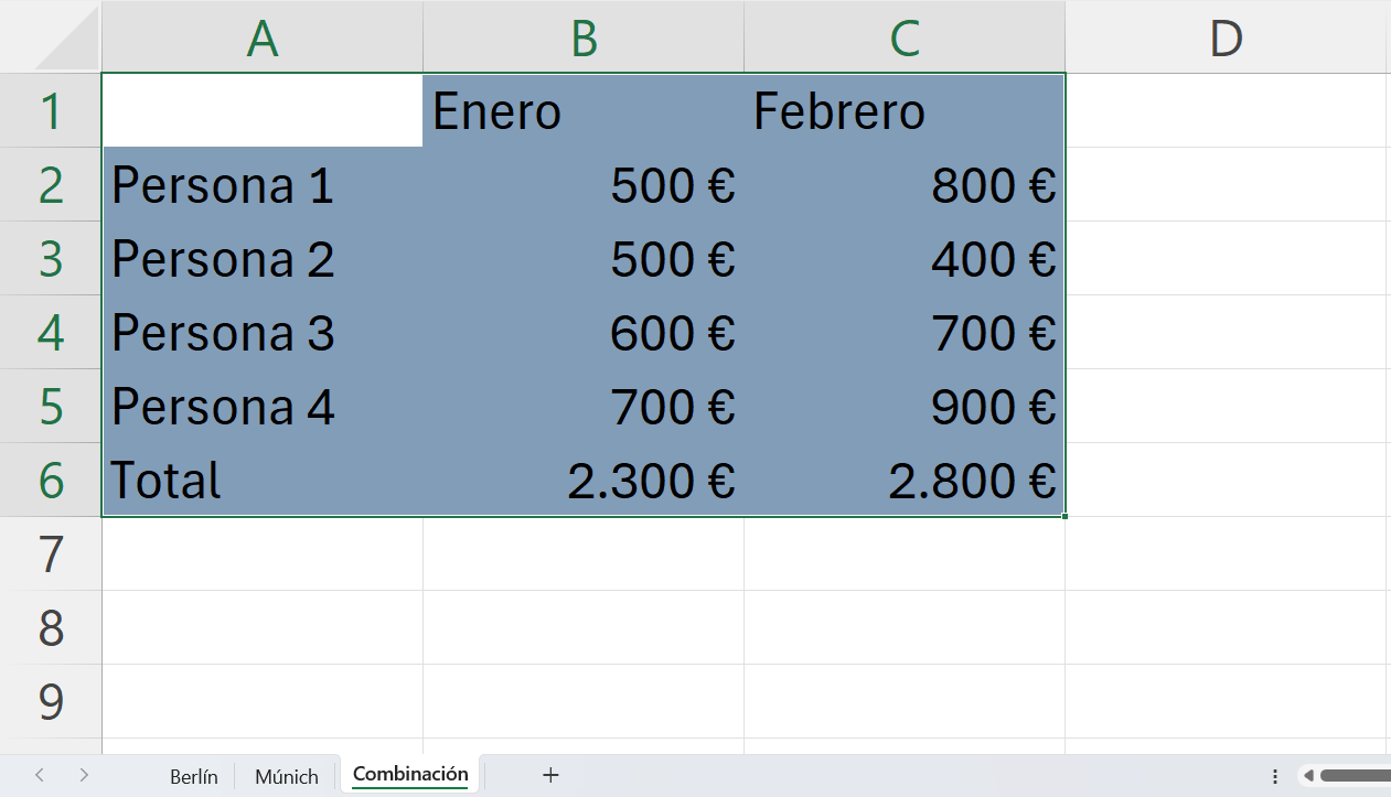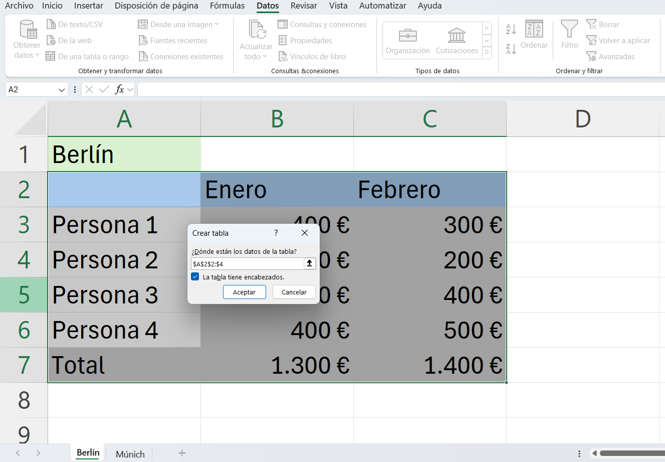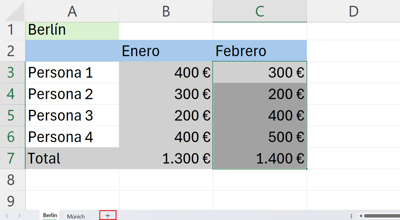 Se quiseres juntar folhas de cálculo no Excel, utiliza a função «Consolidar» do Excel. No entanto, há um requisito que deves ter em conta: o ficheiro do Excel deve conter , pelo menos, duas folhas de cálculo. No exemplo seguinte, vamos juntar os dados dos clientes de Berlim e Munique.