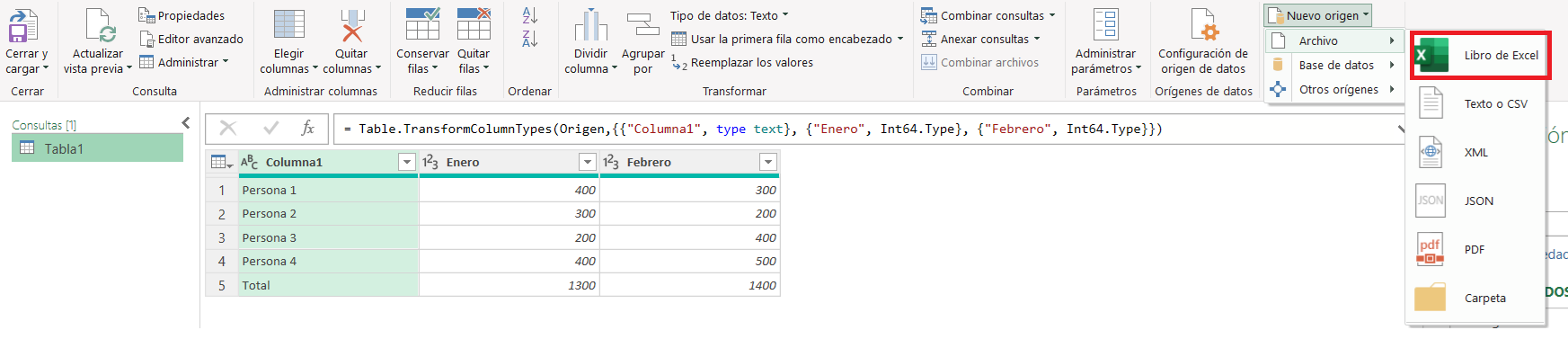 Passo 2. O Power Query Editor irá abrir com o conteúdo da tabela selecionada. Adicione o conteúdo da segunda tabela em «Nova fonte», selecione «Ficheiro» e «Pasta de trabalho do Excel».