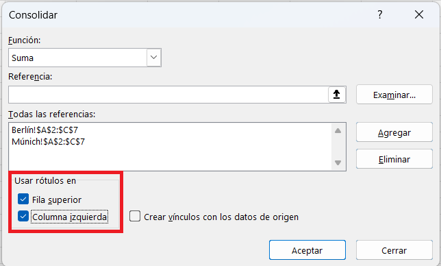 Passo 7. Aceda à folha de cálculo do Excel onde pretende combinar as tabelas. No menu da função «Consolidar», selecione as opções «Linha superior» e «Coluna esquerda» para formatar corretamente a tabela resultante da fusão. Por fim, confirme clicando em «Aceitar».