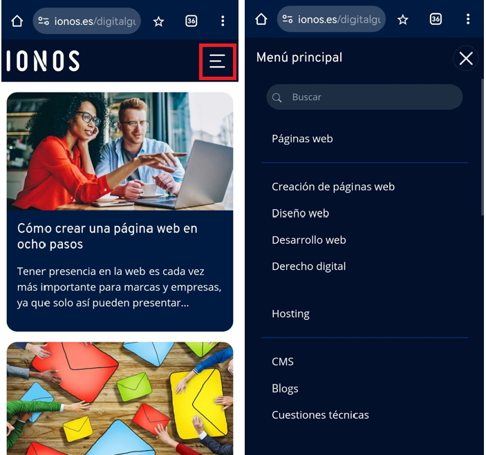 Os menus suspensos são um dos modelos clássicos da navegação responsiva. Eles evocam a estrutura da navegação em computadores desktop, conquistam a confiança dos utilizadores e são frequentemente um conceito de navegação muito seleto. O menu de navegação é ativado ao clicar num botão ou no ícone correspondente e sobrepõe-se ao conteúdo, sem o cobrir completamente.