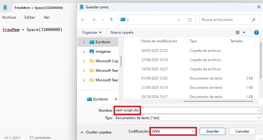 FreeMem = Space(32000000)txtGuarde o ficheiro com o nome pretendido. Se o editor disponibilizar essa opção, certifique-se de que o formato de codificação está definido como ANSI. O último passo consiste em substituir a extensão padrão .txt pela extensão .vbs**. Só assim o Windows poderá identificar que o ficheiro é um script.