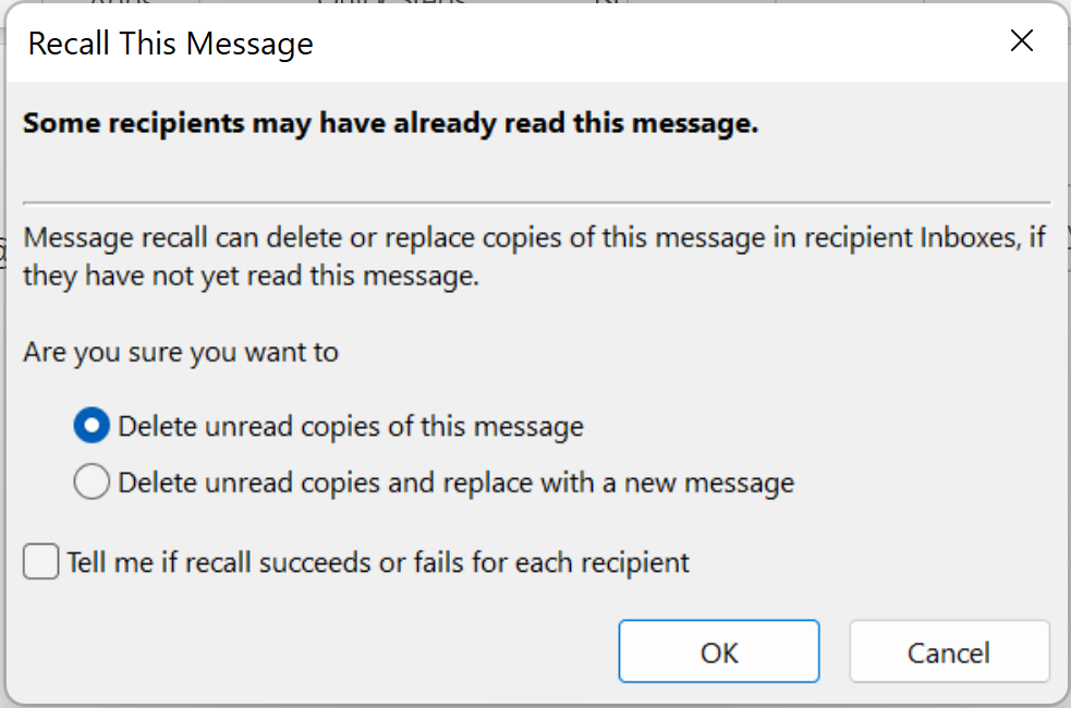 E-poštno sporočilo, poslano prek programa Outlook, je mogoče preklicati le, če so izpolnjeni vsi trije pogoji.