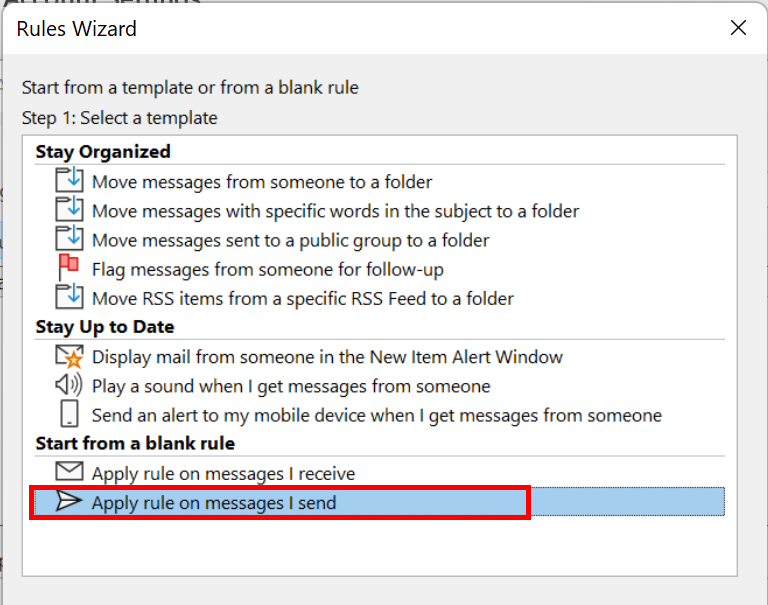 - Izberite možnost Uporabi pravilo za sporočila, ki jih pošiljam, in kliknite Naprej.