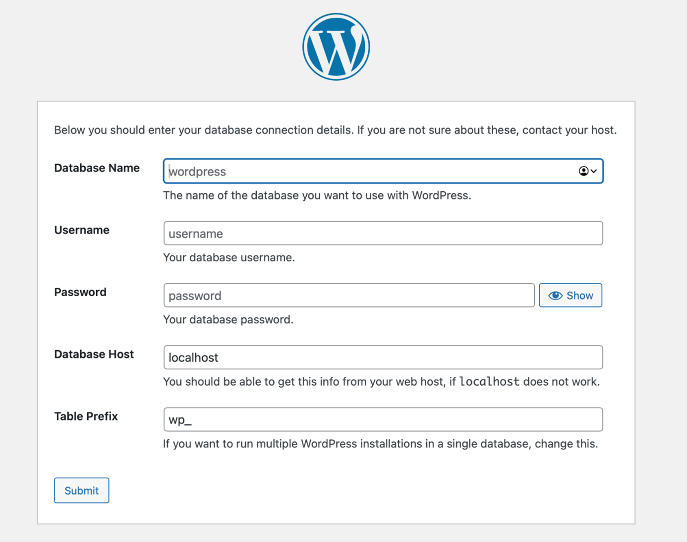 Upoštevajte, da je privzeti uporabnik »root«, če ni drugače navedeno. Vnesite ime baze podatkov, ki ste jo ustvarili, in geslo, ki ste ga izbrali. S klikom na »Pošlji« boste prešli na naslednje korake namestitve.